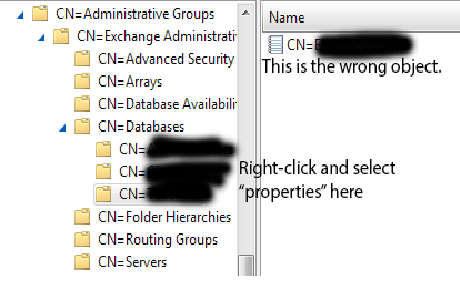 The other info I could find out there called for using ADSI Edit to remove the property, but try as I might I couldn’t find the PublicFolderDatabase property where the App log said it should be. Finally I stumbled on this post which, while not pertaining specifically to Exchange 2013 identified the actual attribute name as “msExchHomePublicMDB”. I still couldn’t find it though until I read this comment, which explained the problem: I had been viewing the properties of the “notebook” object, rather than the “folder” object. (See screenshot below)